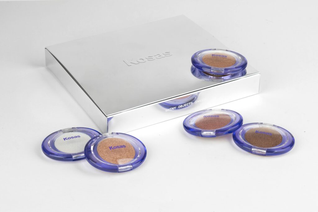 Paper over board hinged lid box with magnetic closure. Spot UV varnish applied to the print, with a brittle paper panel over the product to create a smashable reveal.