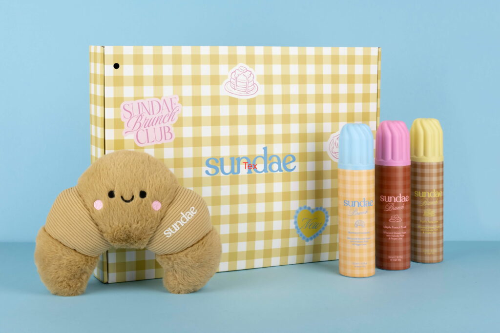 0427 corrugated mailer box with scalloped edge on the opening flap and internal fitment. Printed CMYK. Additionally branded Croissant plushie.