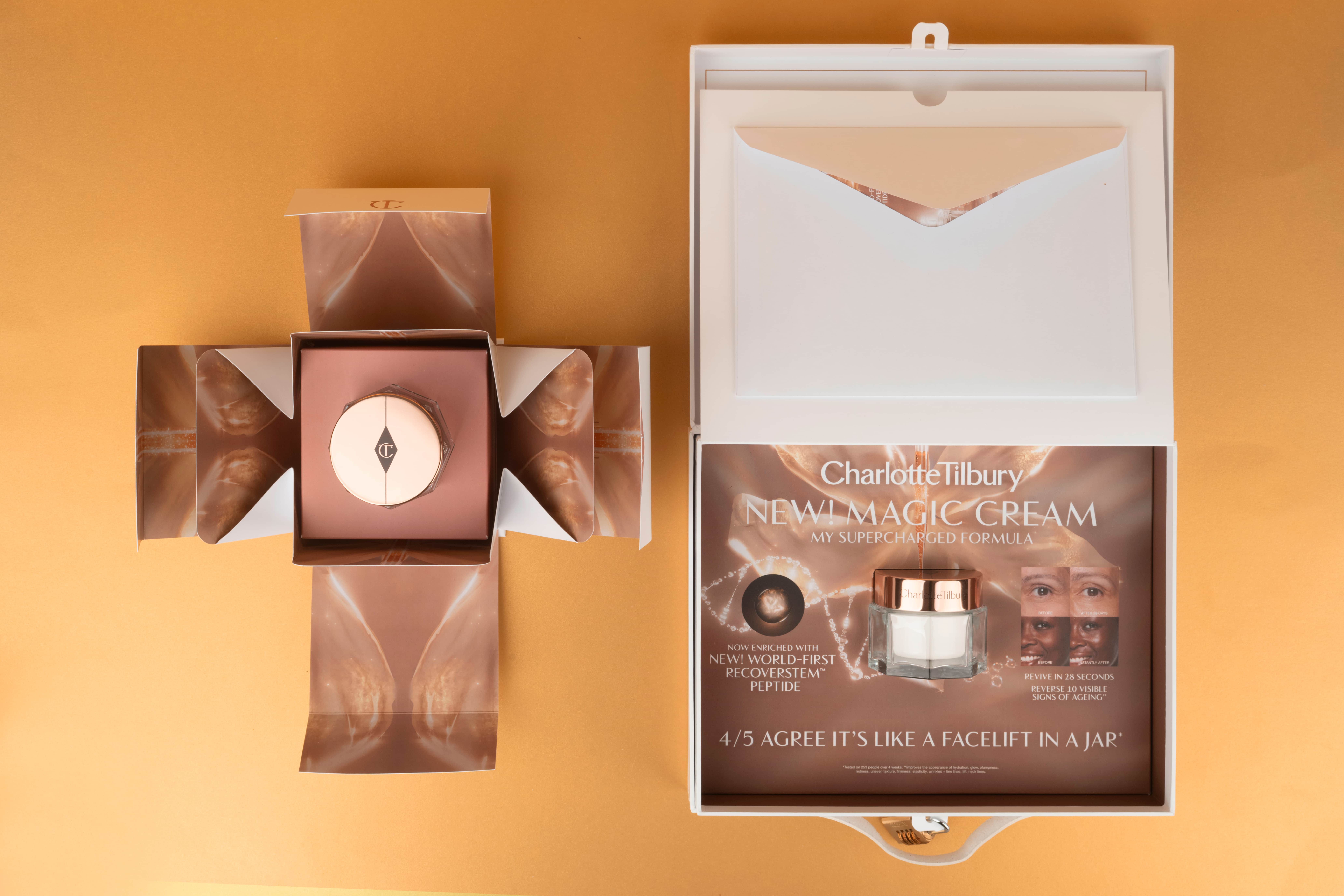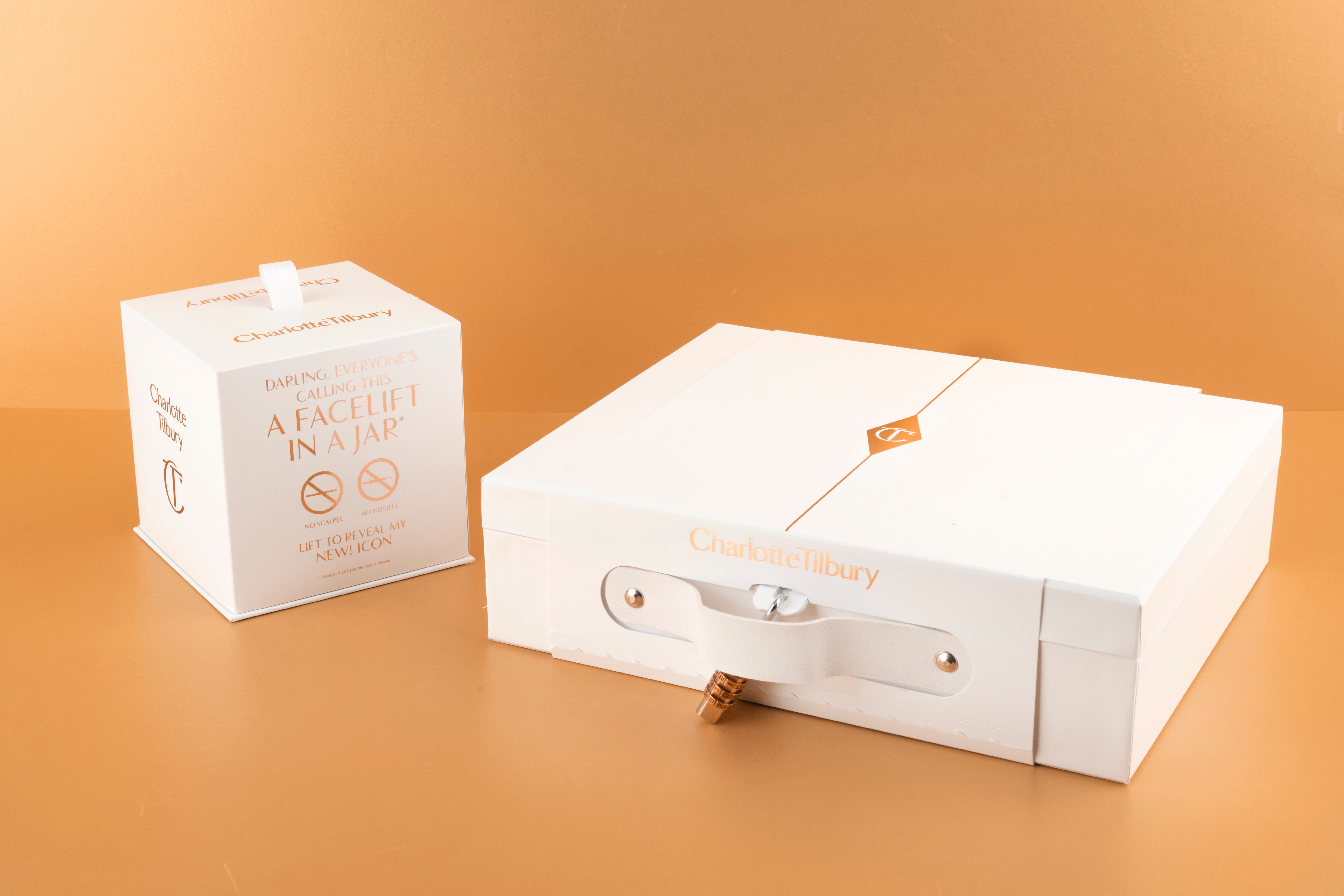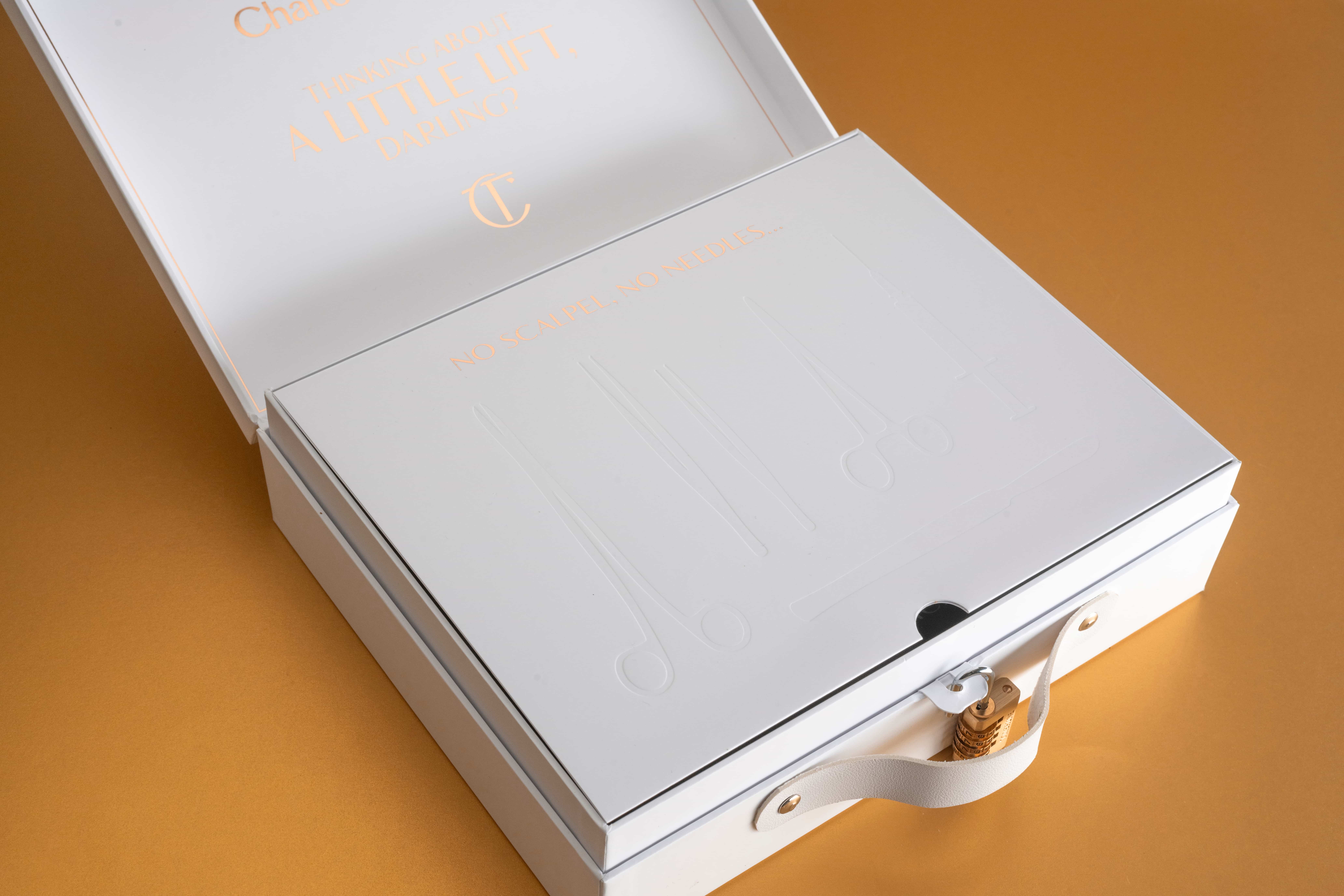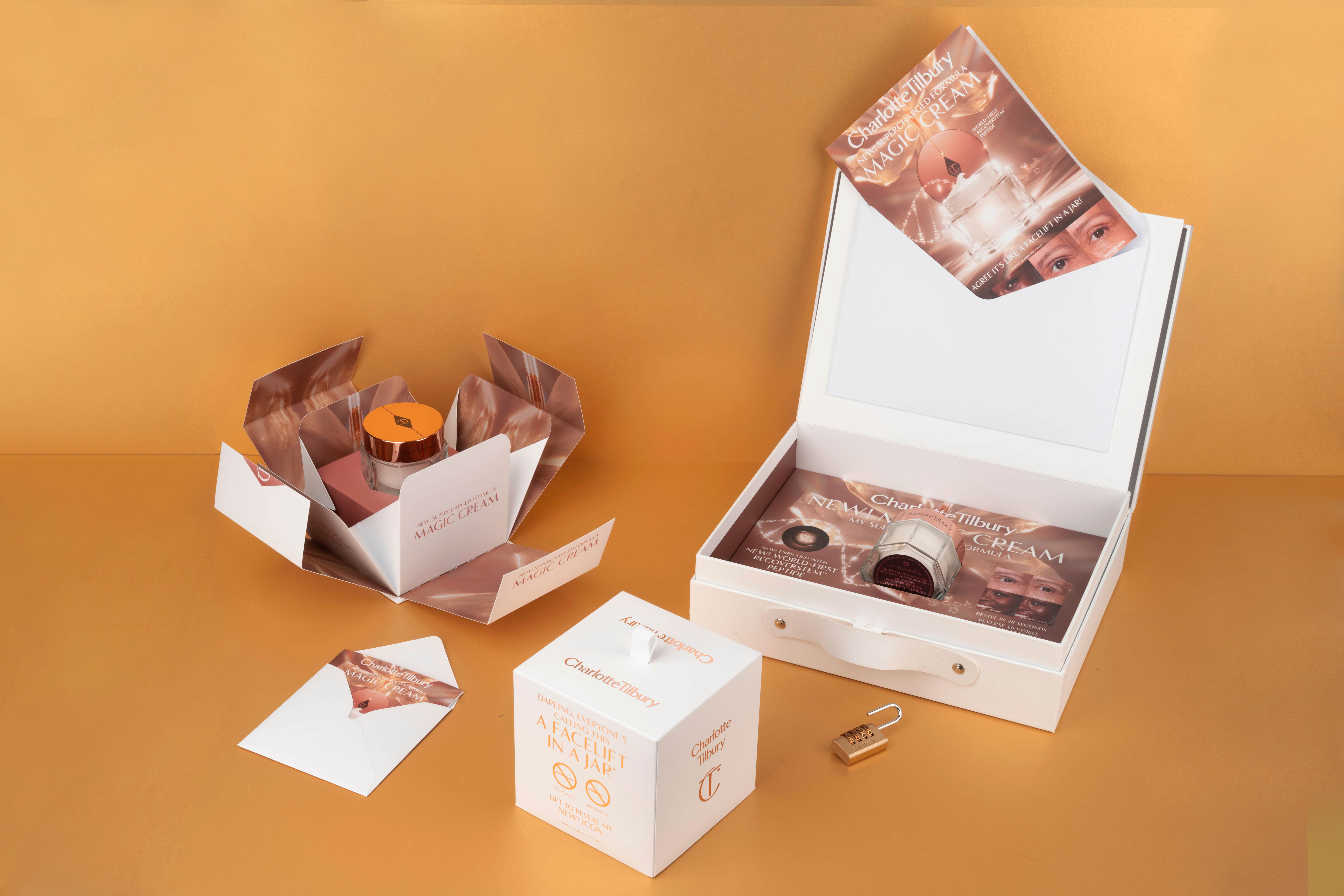 Two-tier mailer. VIP tier designed as a paper over board, briefcase-style mailer with rose gold foil detailing, a hinged overlay panel with blind embossing, an affixed envelope containing printed collateral and locked with a padlock. Standard tier constructed from a folding board box featuring an outward-fanning display upon lid removal.