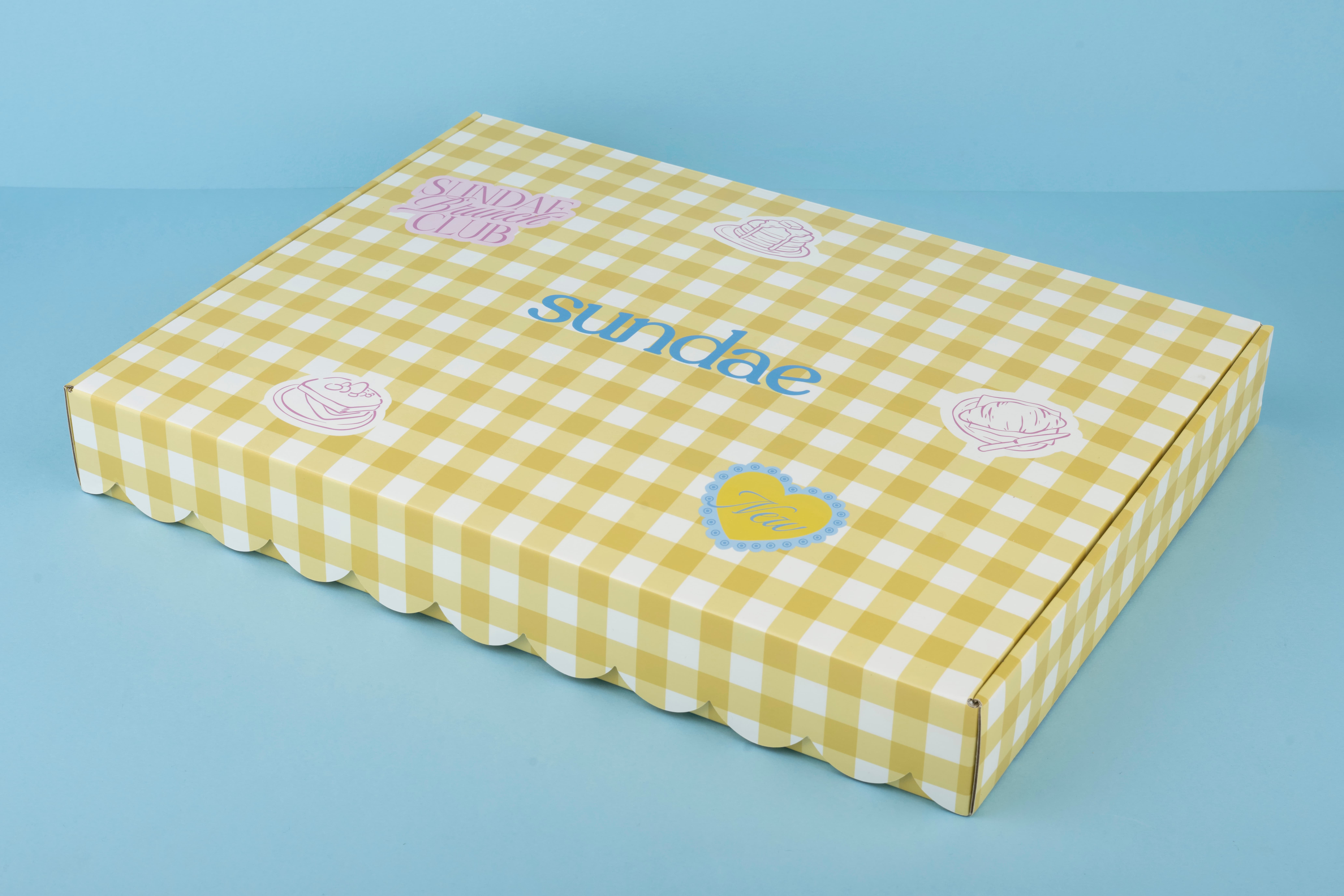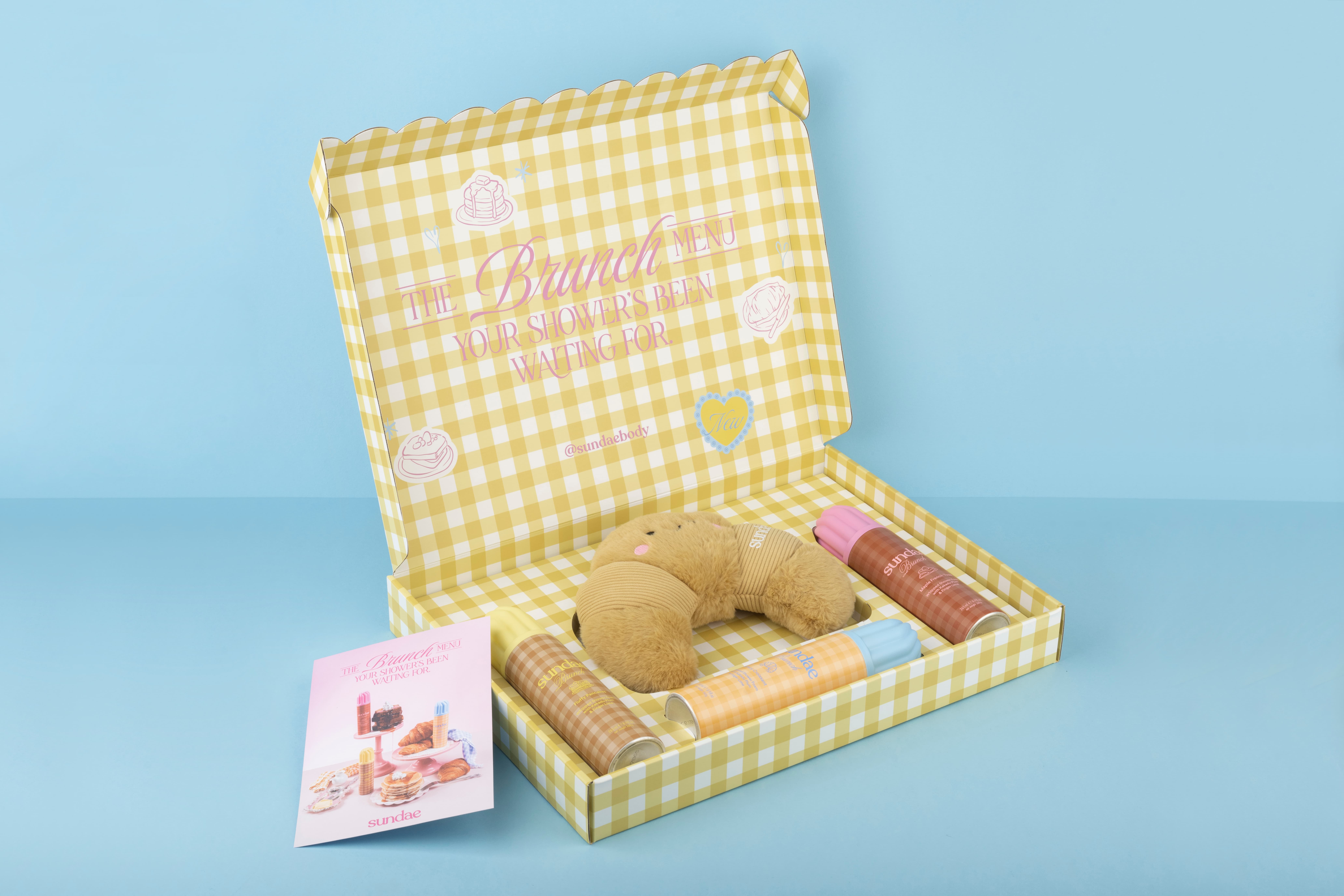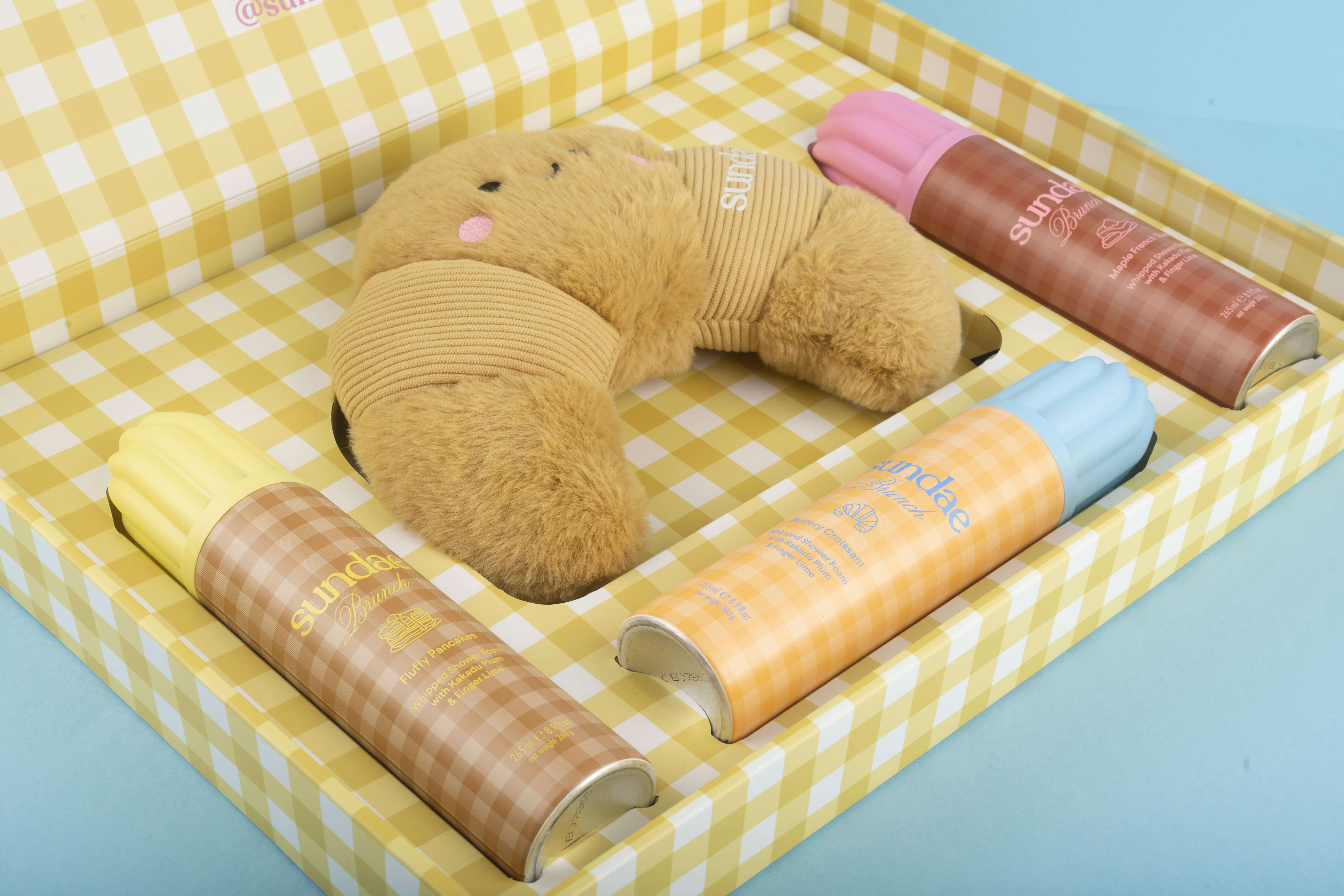0427 corrugated mailer box with scalloped edge on the opening flap and internal fitment. Printed CMYK. Additionally branded Croissant plushie.
