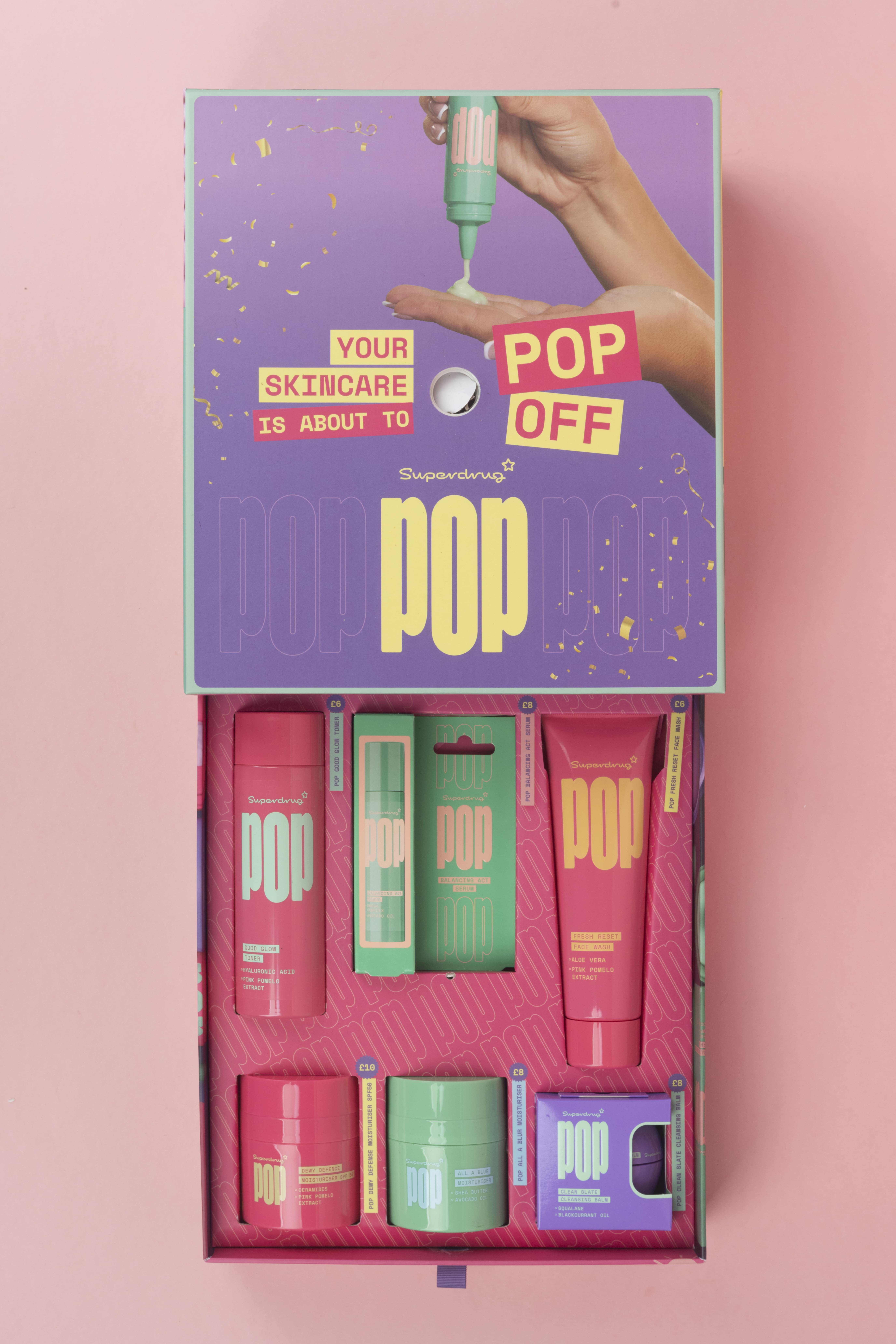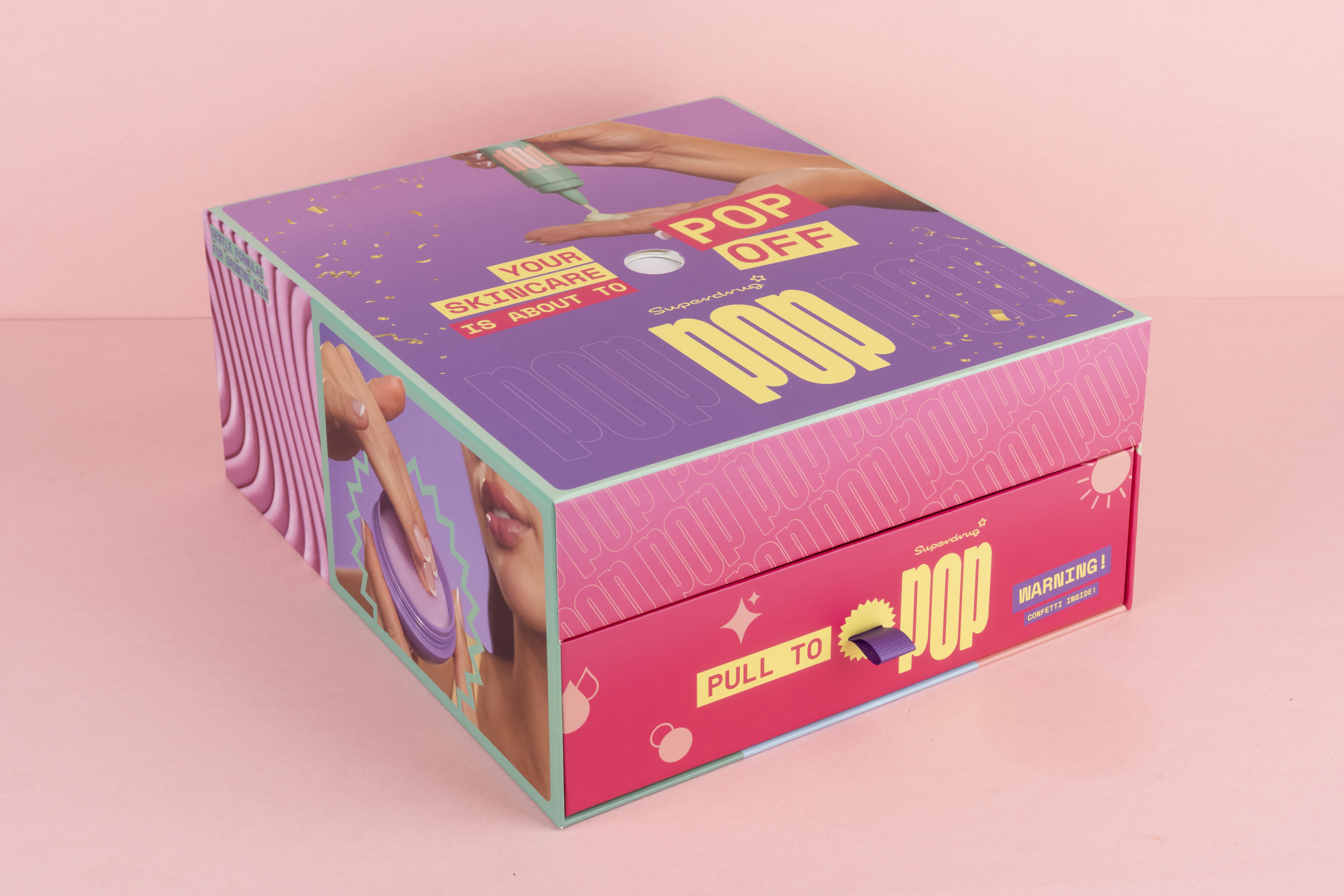 Paper over board drawer box with integrated party popper for a small confetti “pop” upon opening. Includes a custom internal fitment for secure product placement.